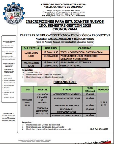 El CEA Delia Gambarte de Quezada, abre inscripciones para el semestre II/2025, es un placer que nuestra Institución abra los espacios de nuestros laboratorios talleres aulas en más de 8 carreras técnicas así como también la formación del área de humanidades desde Educación Primaria de Adultos Educación Secundaria de Adultos, podras en 2 añoss ser bachillera.